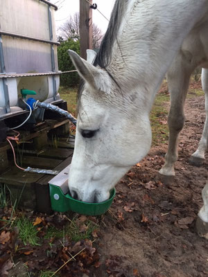 Um das System nun winterfest zu bekommen, muss man also zusehen, dass weder das Wasser im Tank friert, noch das im Schlauch oder im Tränkebecken. Man braucht also zwei Heizkabel, von denen eines im Tank liegt und das zweite um den Schlauch gewickelt wird. Für das Tränkebecken gibt es eine Heizplatte, die man leicht dort installieren kann. Nun braucht man nur noch einen Trafo und einen Stromanschluss, und fertig ist die beheizte Tränke! Natürlich ist wie immer im Umgang mit Pferden darauf zu achten, dass alles gut versteckt und befestigt ist und keine Kabel angeknabbert werden können.