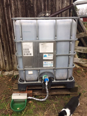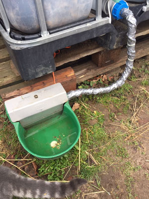 Wie sieht es also aus? Wir bieten unseren Pferden so weit es geht Regenwasser zum trinken an. Dieses befindet sich in einem IBC-Tank und läuft von dort über einen kurzen Schlauch in ein Tränkebecken mit Schwimmer. Das heißt, es befindet sich immer eine bestimmte Menge Wasser im Tränkebecken, und die Pferde müssen nicht pumpen, um Wasser zu bekommen.